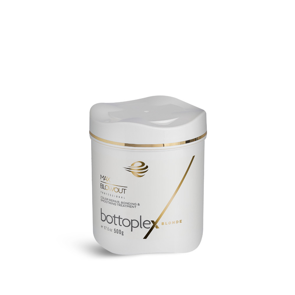 Max Blowout Bottoplex BLONDE is an advanced smoothing, repairing, and bonding treatment with tone-correcting pigments specifically formulated for bleached blonde, over processed hair. This unique product is the first of its kind on the market and it combines three product concepts into one: Hair BTX, Collagen, and Olaplex. It also contains a color and tone correction formula, which has the capability to correct and neutralize the brassiness that can occur as a result of bleach treatments and oxidation. The built-in toners boost cool tones and deliver captivating shine to blonde hair. The result is beautifully smooth, healthy, shiny, and frizz-free blonde hair with an amazing color.
