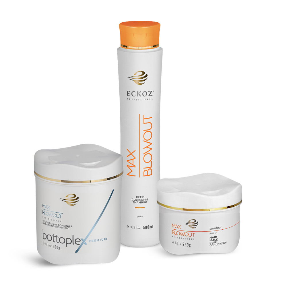 Max Blowout Bottoplex Premium is an advanced smoothing, repairing, and bonding treatment specifically formulated for over-processed and damaged hair. This unique all-in-one product is the first of its kind on the market, which we developed by combining three product concepts into one: Hair BTX, Collagen, and Olaplex. Our innovative product has been carefully formulated with a proprietary blend of ingredients including pro-vitamin D-Panthenol, Collagen, amino acids, vitamins A and E, and supercharged with Natural Oils from the Amazon rainforest including Macadamia nut oil, Buriti fruit, and Acai berry. Our unique treatment will bring any hair type back to life. The result is smooth, shiny, and frizz-free hair with an amazing softness. This gentle but powerful treatment can be safely repeated every month if desired in order to keep up with monthly coloring, free radicals, and other treatments that can damage the hair. Hair will look noticeably healthy and beautiful all the time. Results will last up to 6-8 weeks.